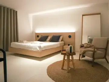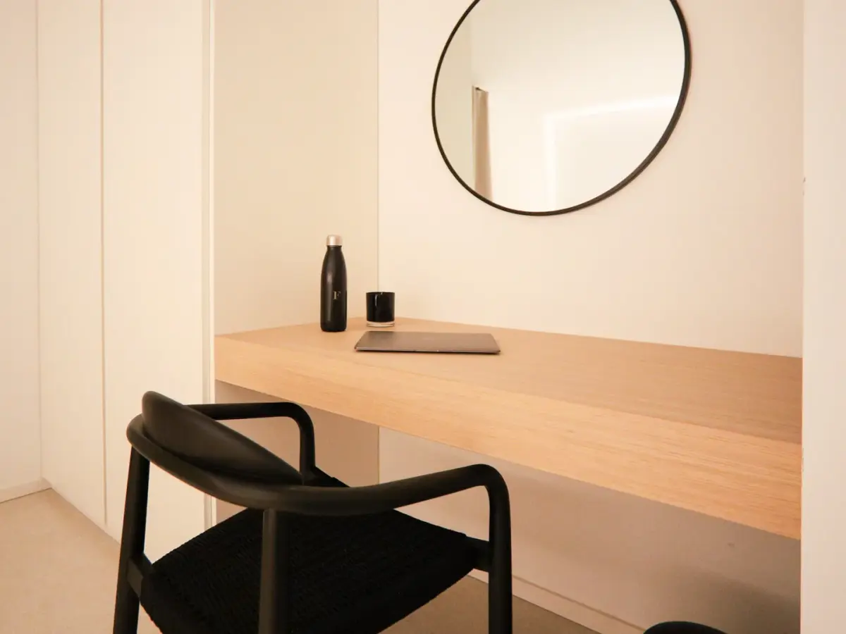 The open-plan living area, with floor-to-ceiling windows, invites you to soak in panoramic lake and garden views. The fully equipped kitchen is perfect for entertaining or intimate meals.