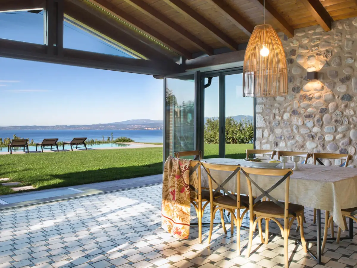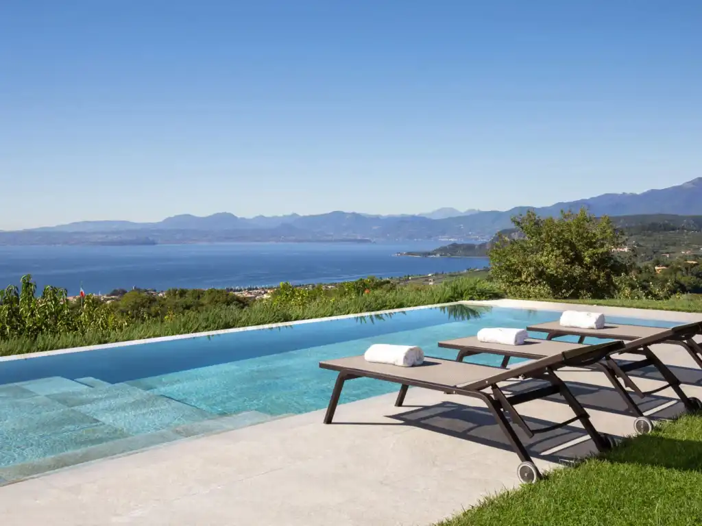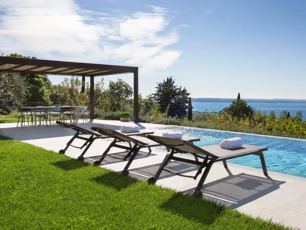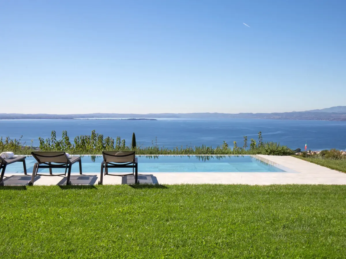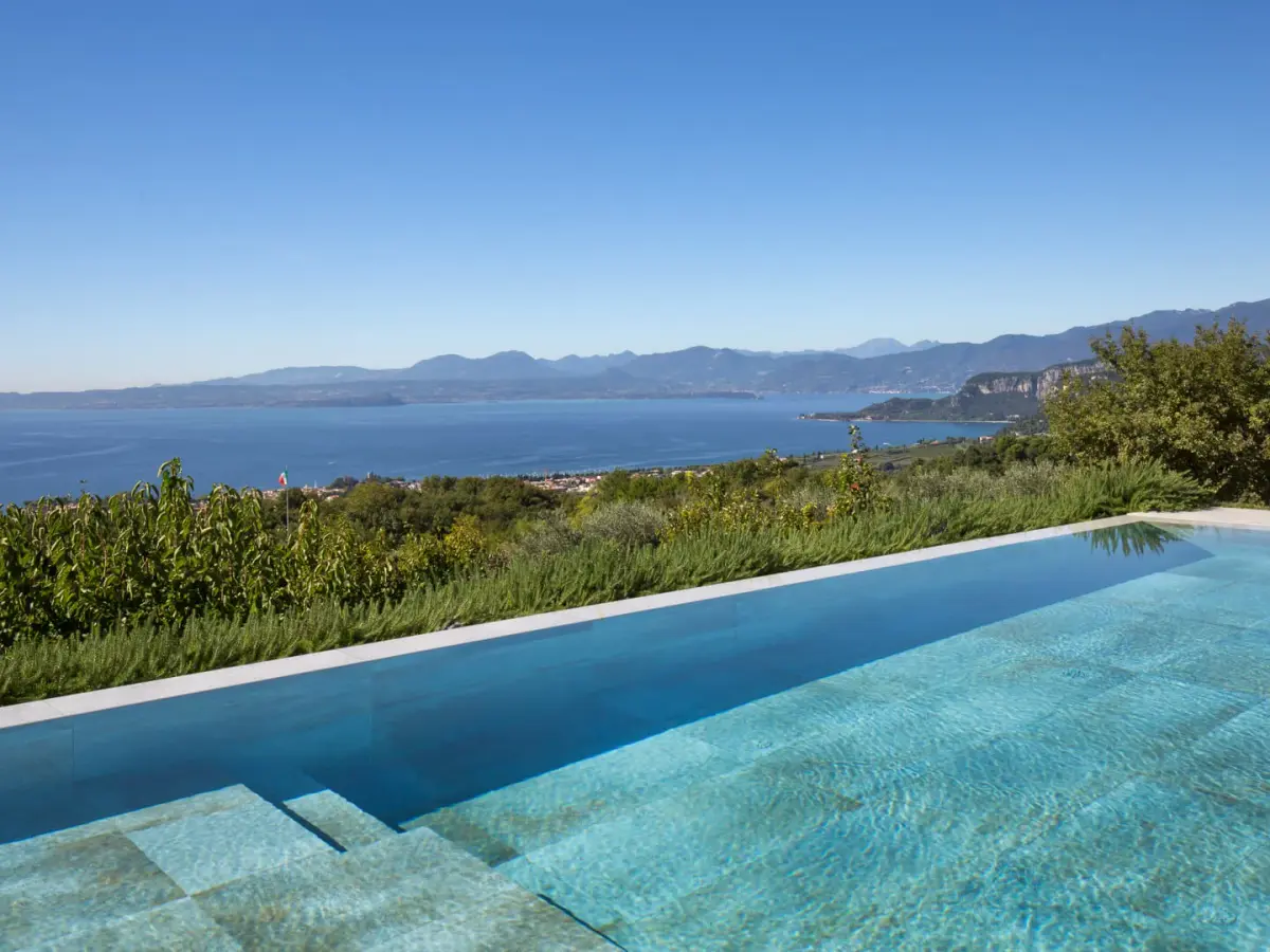 Perched on the hills above Bardolino, this private lakeview villa overlooks the shimmering expanse of Lake Garda with uninterrupted, panoramic views. Set within a quiet, prestigious enclave surrounded by nature, it offers rare privacy just minutes from Cavaion Veronese and the lakeside charm of Bardolino. Designed for effortless living, the home centres around a pool that appears to dissolve into the horizon, complete with its own private bathroom. A panoramic outdoor sauna invites slow evenings under open skies, while floor-to-ceiling windows draw natural light deep into the interiors. An elegant open-plan layout connects the fully equipped kitchen, lake-facing dining area, and a generous living room anchored by an oversized sofa. Outside, a covered veranda sets the scene for long alfresco meals and sunset views. Four double bedrooms share two contemporary bathrooms. A private garage and barbecue area complete this refined Lake Garda retreat.
