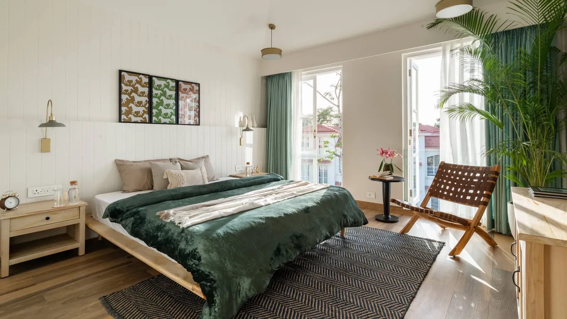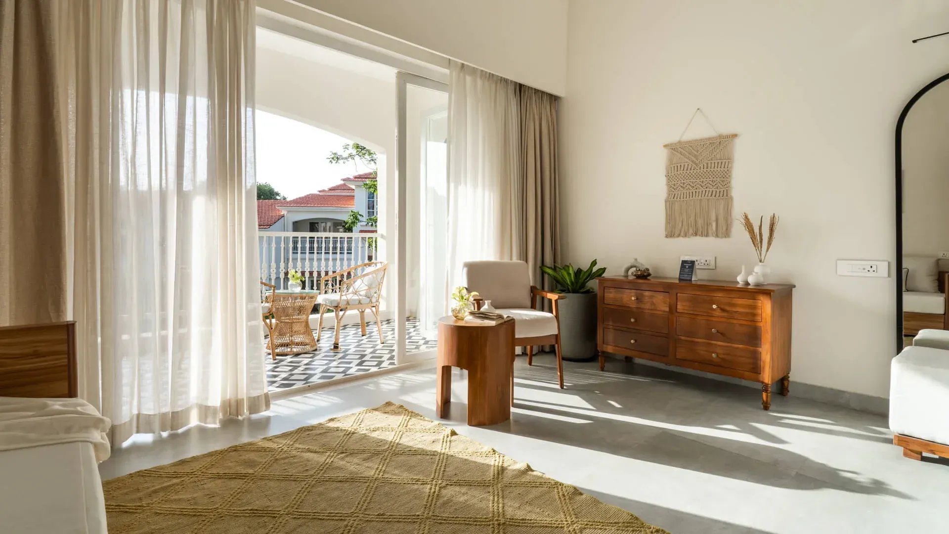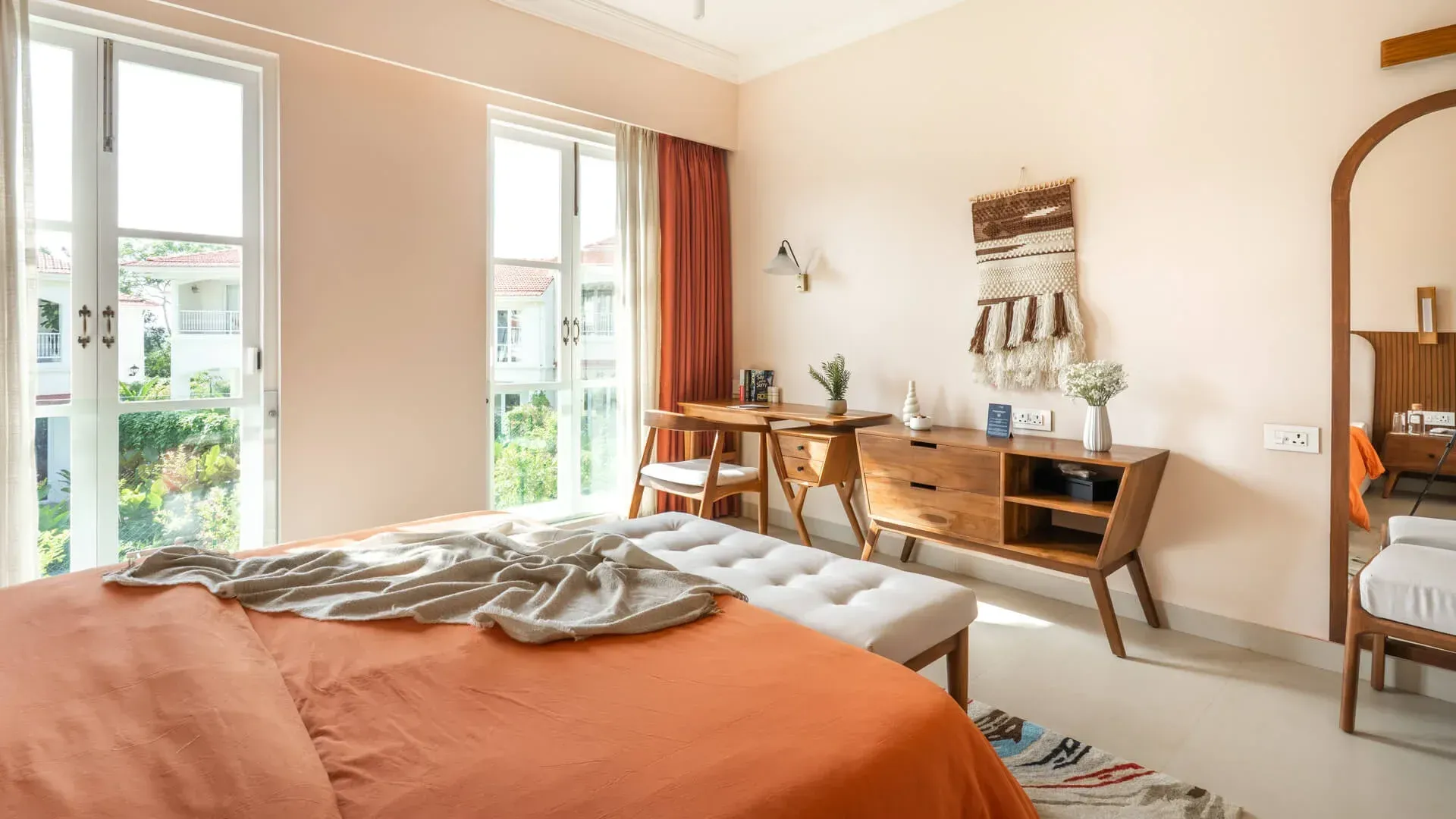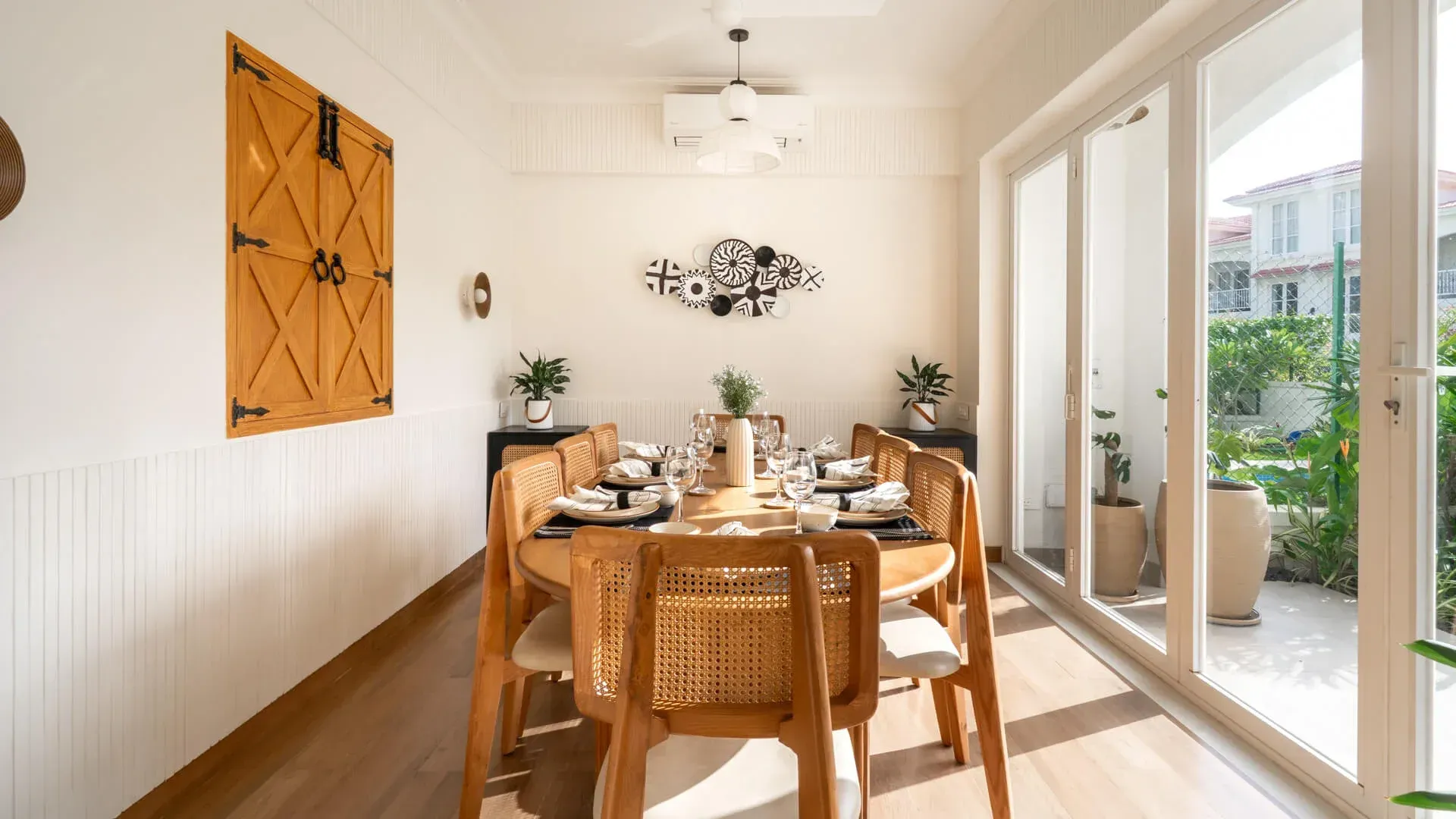 Chicly designed in soothing tones of white and beige, Aurelia Villa D is an oasis of calm and an excellent choice for a beach villa in Goa. Drawing inspiration from the concept of ‘Vaddo,’ this three-bedroom property fosters community living, sustainability, and social connection. The living and dining areas are enhanced with beautifully arched doors that let in plenty of natural light. The floors are laid with intricate tilework, creating an aesthetic and comfortable space for your getaway to Goa.