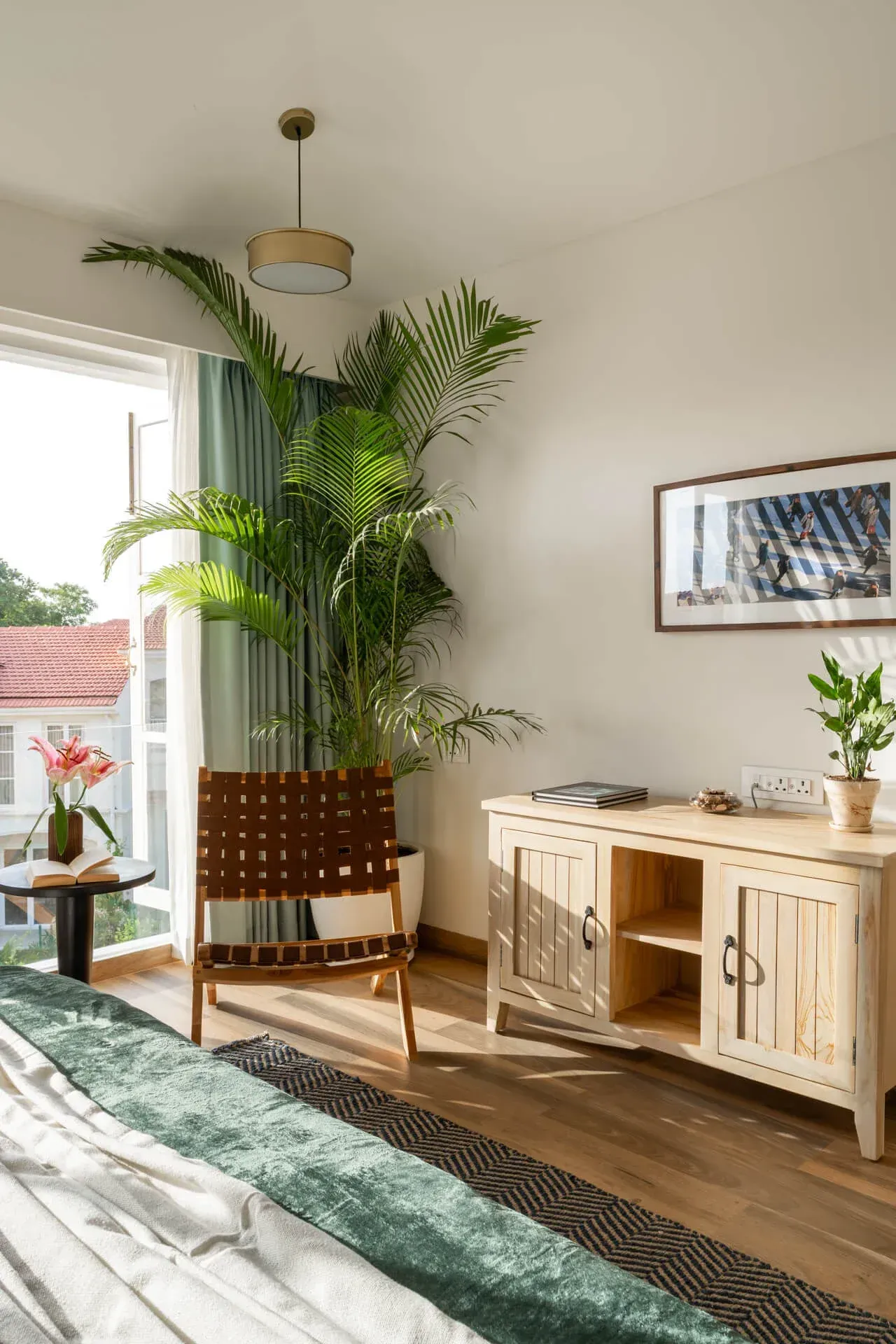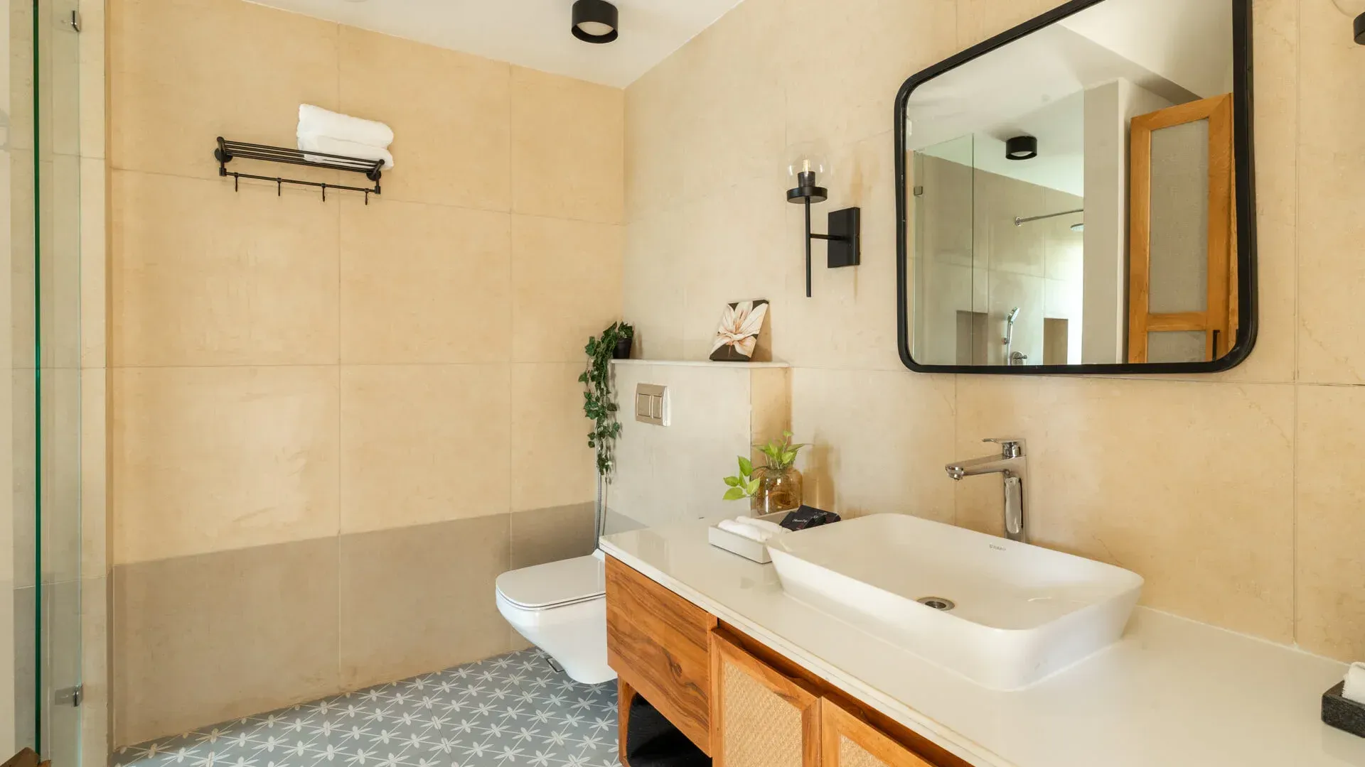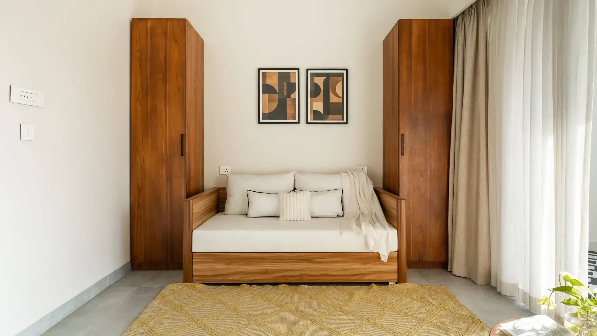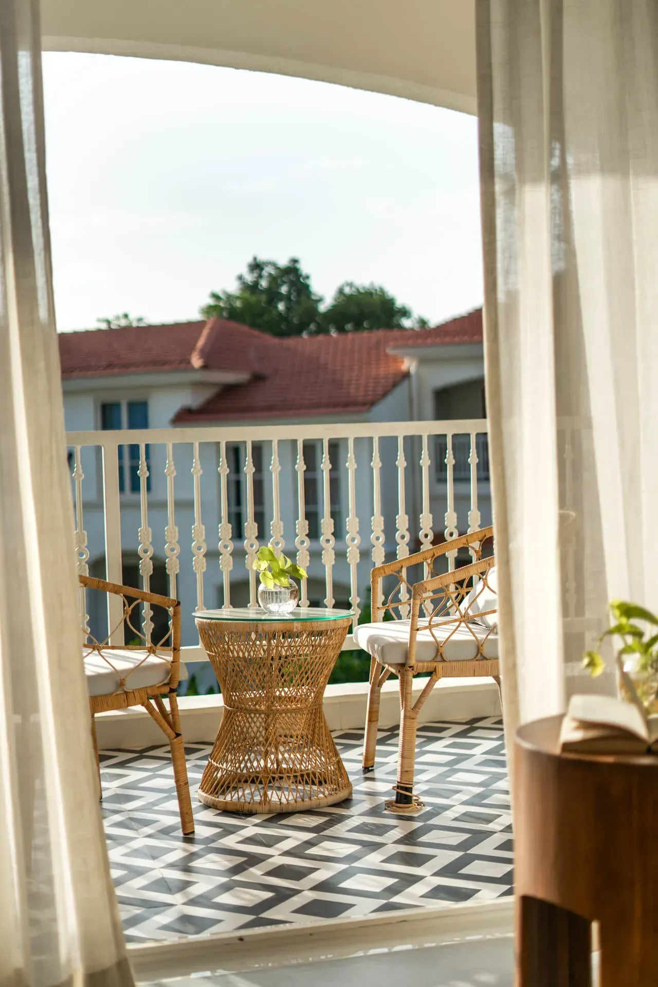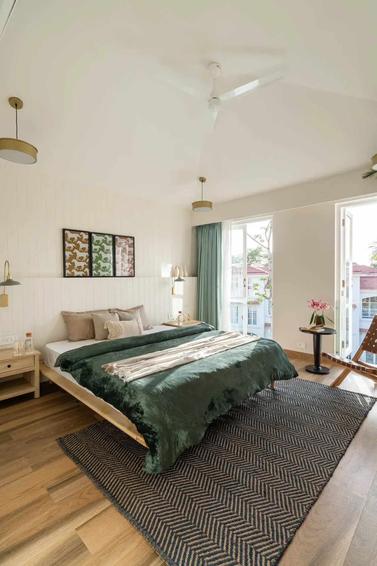 Chicly designed in soothing tones of white and beige, Aurelia Villa D is an oasis of calm and an excellent choice for a beach villa in Goa. Drawing inspiration from the concept of ‘Vaddo,’ this three-bedroom property fosters community living, sustainability, and social connection. The living and dining areas are enhanced with beautifully arched doors that let in plenty of natural light. The floors are laid with intricate tilework, creating an aesthetic and comfortable space for your getaway to Goa.