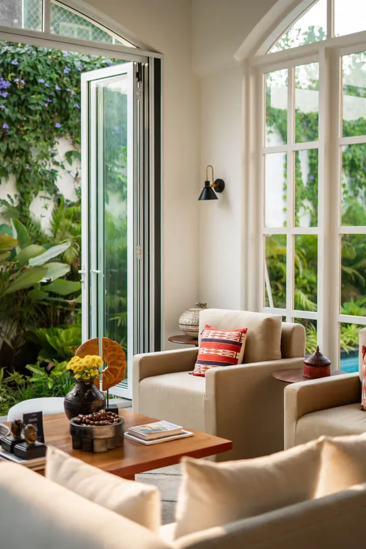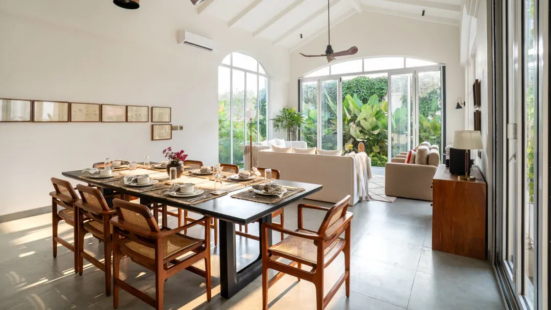 Chicly designed in soothing tones of white and beige, Aurelia Villa D is an oasis of calm and an excellent choice for a beach villa in Goa. Drawing inspiration from the concept of 'Vaddo,' this three-bedroom property fosters community living, sustainability, and social connection. The living and dining areas are enhanced with beautifully arched doors that let in plenty of natural light. The floors are laid with intricate tilework, creating an aesthetic and comfortable space for your getaway to Goa.