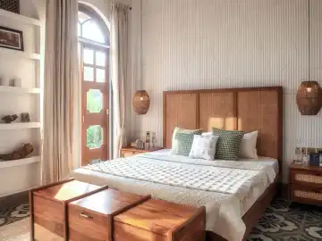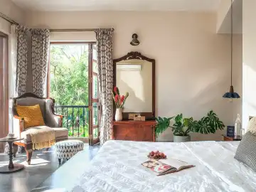 Tucked away in the lush greenery of Siolim, Calisto Villa A is a stunning 4-bedroom retreat by Isprava, offering a serene escape from the city. With a seamless blend of contemporary Mediterranean design and subtle bohemian influences, the villa invites you to unwind in a space that exudes tranquility. Warm wooden interiors and earthy tones create a welcoming atmosphere, making this the ideal getaway for families or large groups of friends seeking a peaceful villa in Goa.