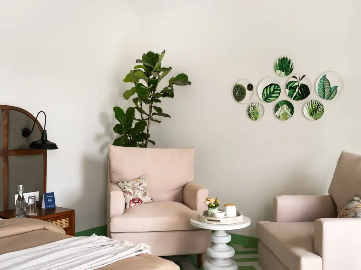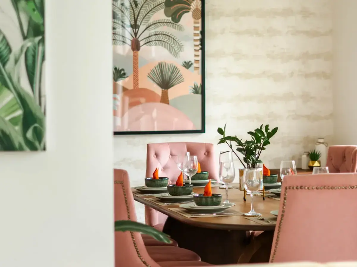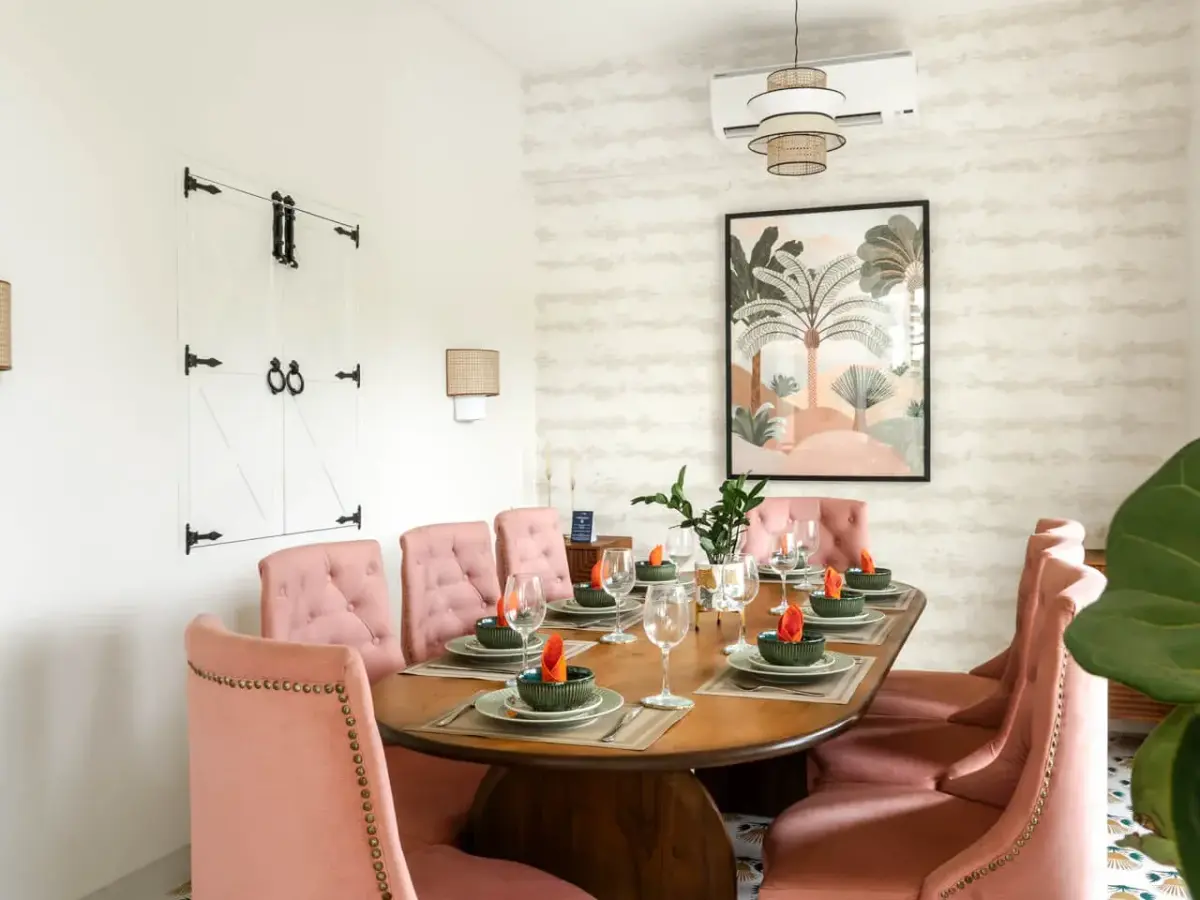 This villa features expansive windows that seamlessly blend the indoors with the outdoors, complemented by modern interiors and pink floral accents that create a welcoming atmosphere. Gather in the living area, enjoy in-house games, or relax by the private pool.