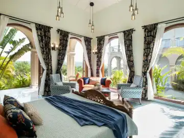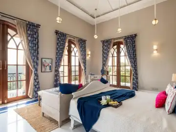Set atop the hills of Mandrem, Sacri Borod Hill 6 is part of an exclusive villa community in Goa. Boasting majestic Mediterranean architecture and ethereal views of the surrounding vegetation, the villa is an idyllic getaway for large groups. Find a cosy corner in one of the 5 ensuite bedrooms or gather with your friends and family in the elegant living room. Enjoy a playful match in the games room or watch the sunset from one of the balcony sit-outs overlooking the Ashwem sea. Dip in the private pool or take a stroll in the luscious green gardens.