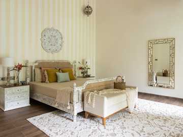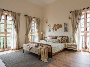 With its Isprave build touches, this villa in Goa seamlessly blends contemporary design with a touch of retro Hollywood charm. Every corner of the villa is a work of art, telling a story of its own. As you enter, you'll be greeted by a quaint living room, perfect for relaxing with loved ones and enjoying a movie. The dining room boasts expansive glass windows that overlook the verdant surroundings, creating an idyllic setting for leisurely lunches.