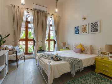 Escape to modern luxury in Goa. Nestled amid quaint homes and lush greenery in Siolim, Villa Maraville is a vision in white. Reminiscent of traditional Goan homes, the Isprava-built villa makes for a luxurious tropical getaway. The 4 bedrooms with ensuite bathrooms use pastels, wood and earthy tones echoing the effortlessness of a Goa holiday.