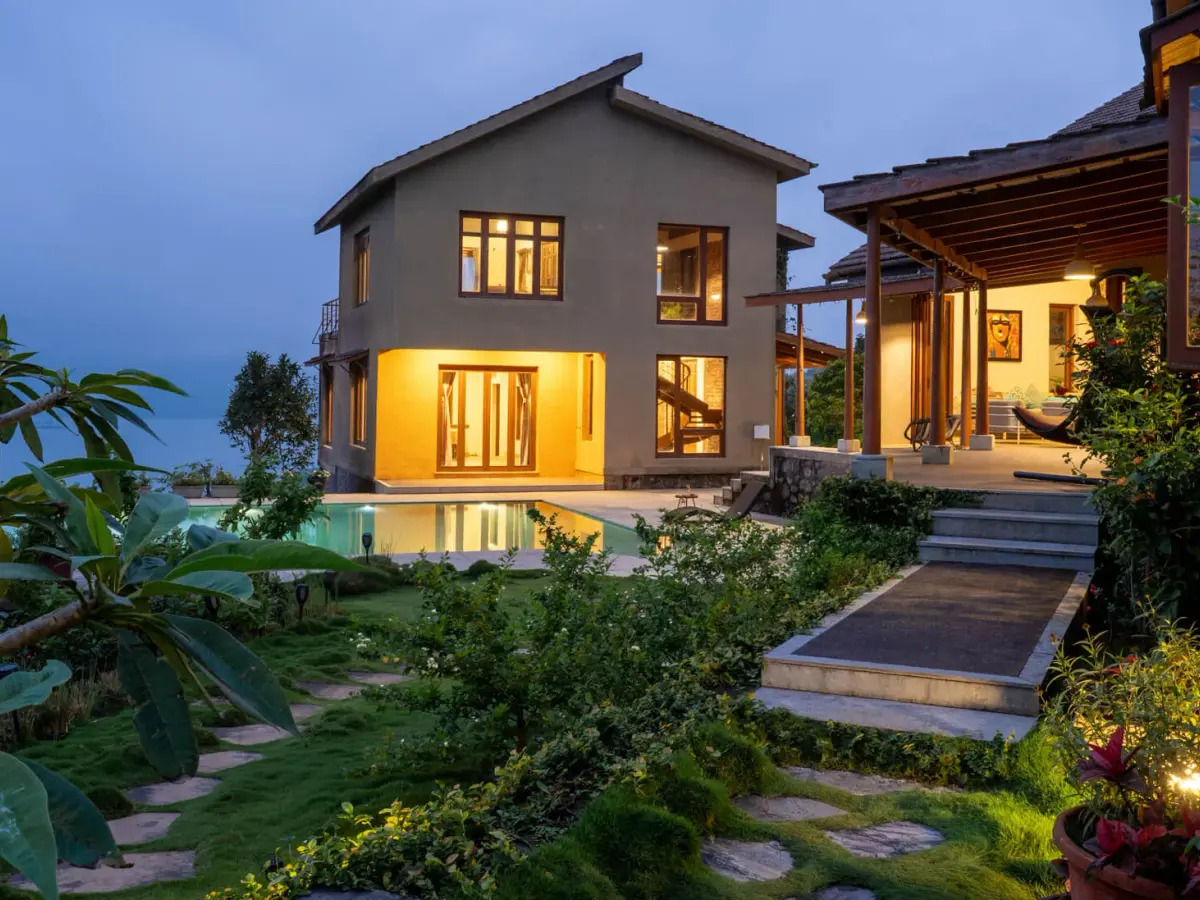 Overlooking the Sahyadris and the serene Pawna Lake, Om Anantha emerges inconspicuously with earth-toned structures. Following the meandering terrain, the 5-bedroom home comprises independent living and bedroom blocks that allow for maximum privacy and a splendid infinity pool that will take your breath away. The living and dining area, with its double-height ceiling, allows the sun to intermingle and cast beautiful shadows throughout the day while offering picture-perfect views of the outdoors. From open-air bathrooms to beautiful decks and patios, the bedrooms are perfect for those lazy, breezy afternoons.